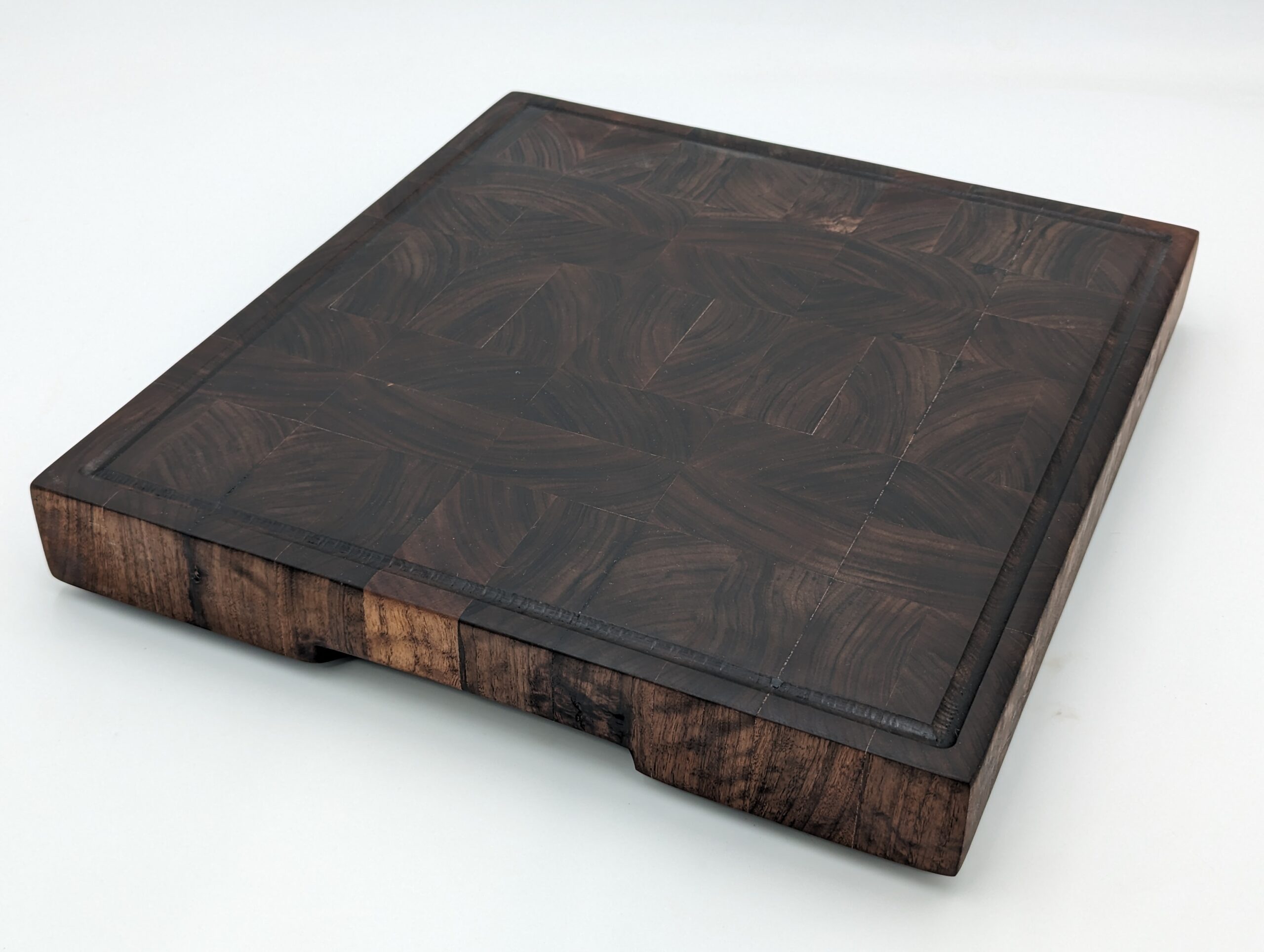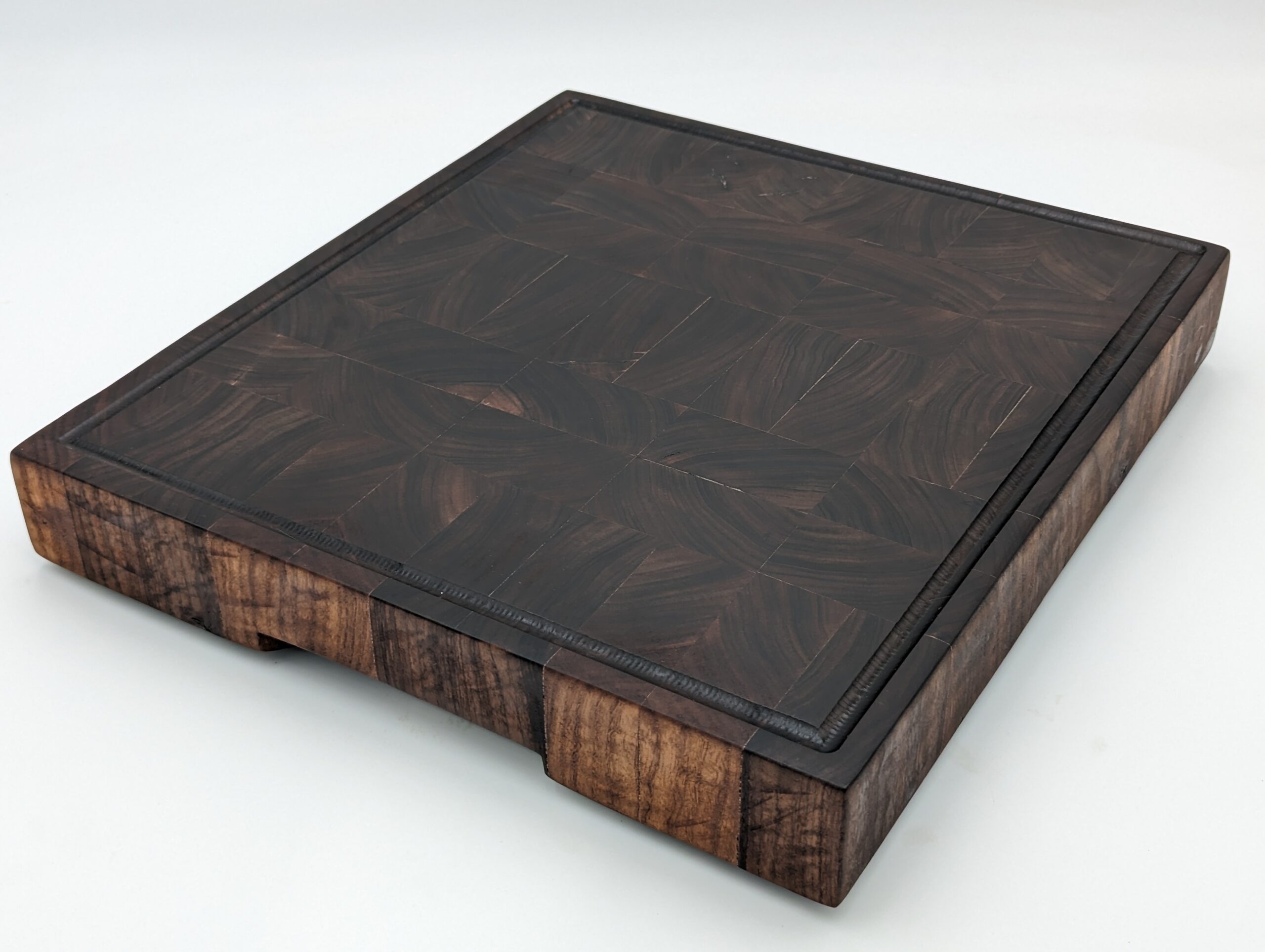 End-Grain boards are exceptionally durable and resistant to knife marks. Built to last a lifetime. Finished with 100% food grade Tung oil. This board includes a juice groove, recessed handles, and rubber feet to ensure it stays in place while you’re cutting.